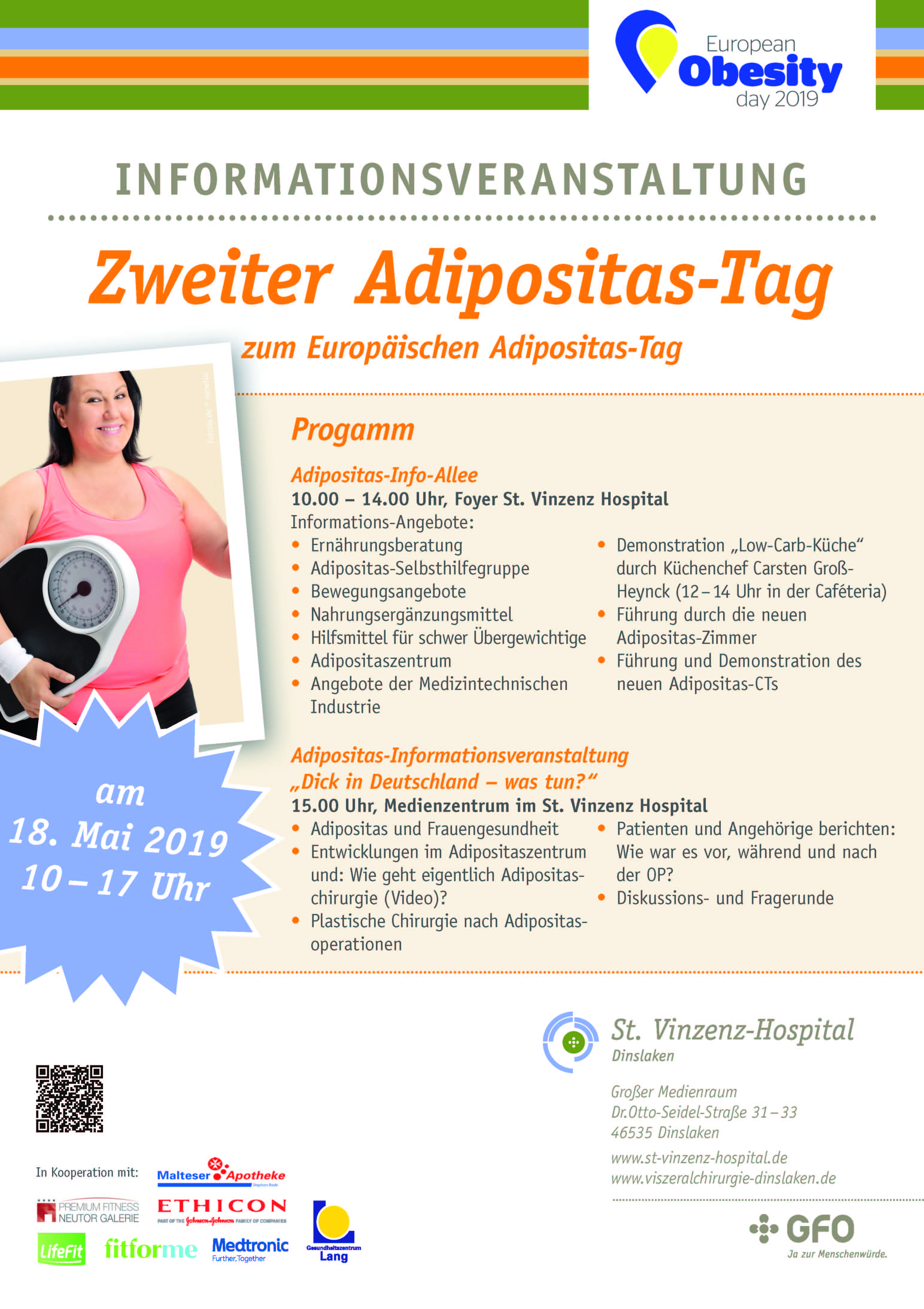 Anlässlich des Europäischen Adipositastages („European Obesity Day“) möchten wir an unserem 2. Dinslakener Adipositastag erneut rund um das Thema Adipositas informieren. Kommen Sie tagsüber in das Foyer und informieren Sie sich auf der interessanten und unterhaltsamen Adipositas-Info-Allee oder besuchen Sie um 15.00 Uhr die Informationsveranstaltung „Dick in Deutschland– was tun?“ im Medienzentrum.